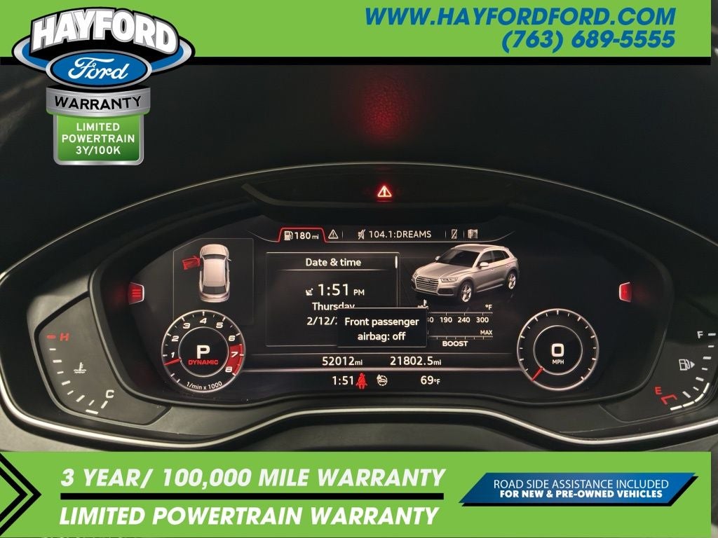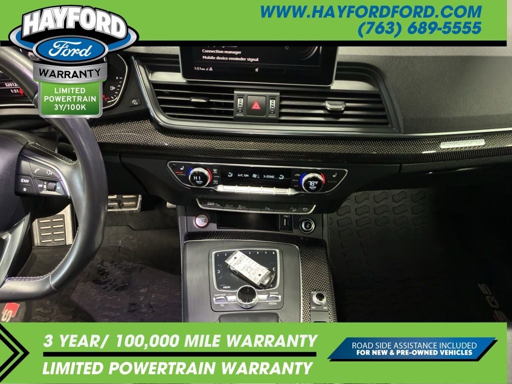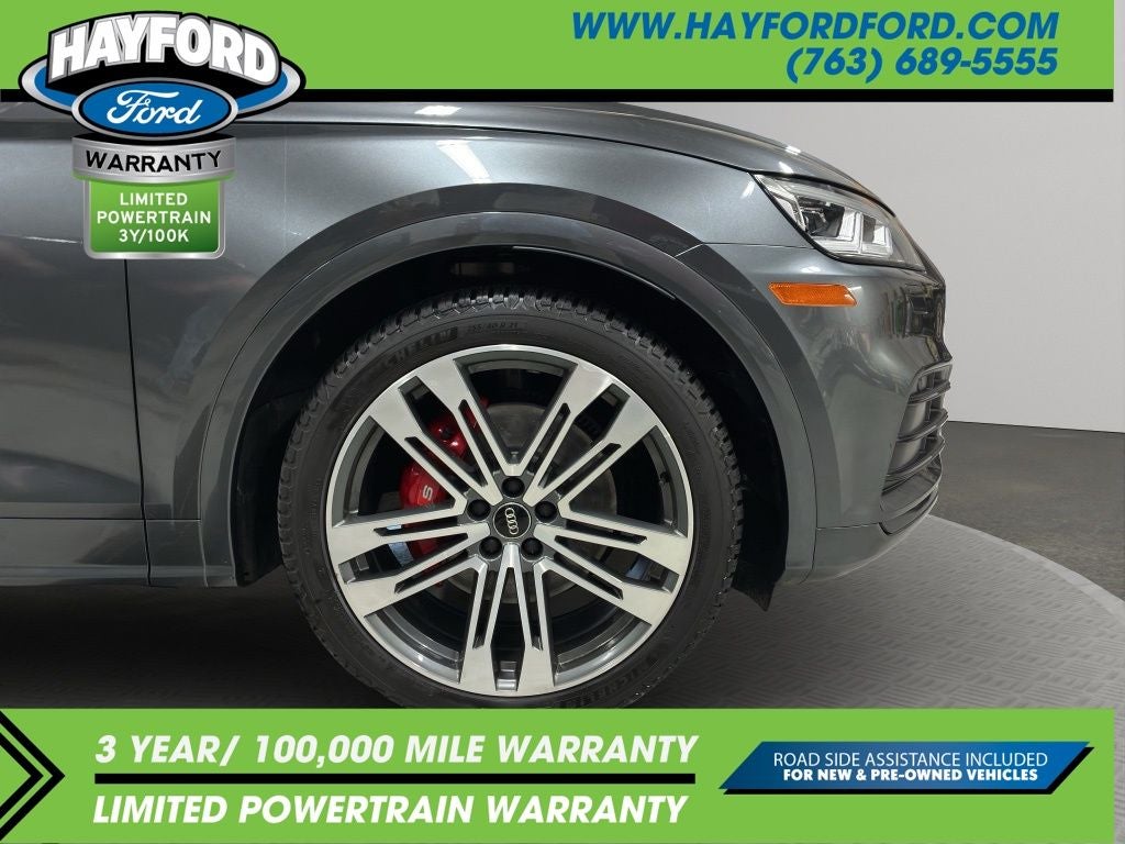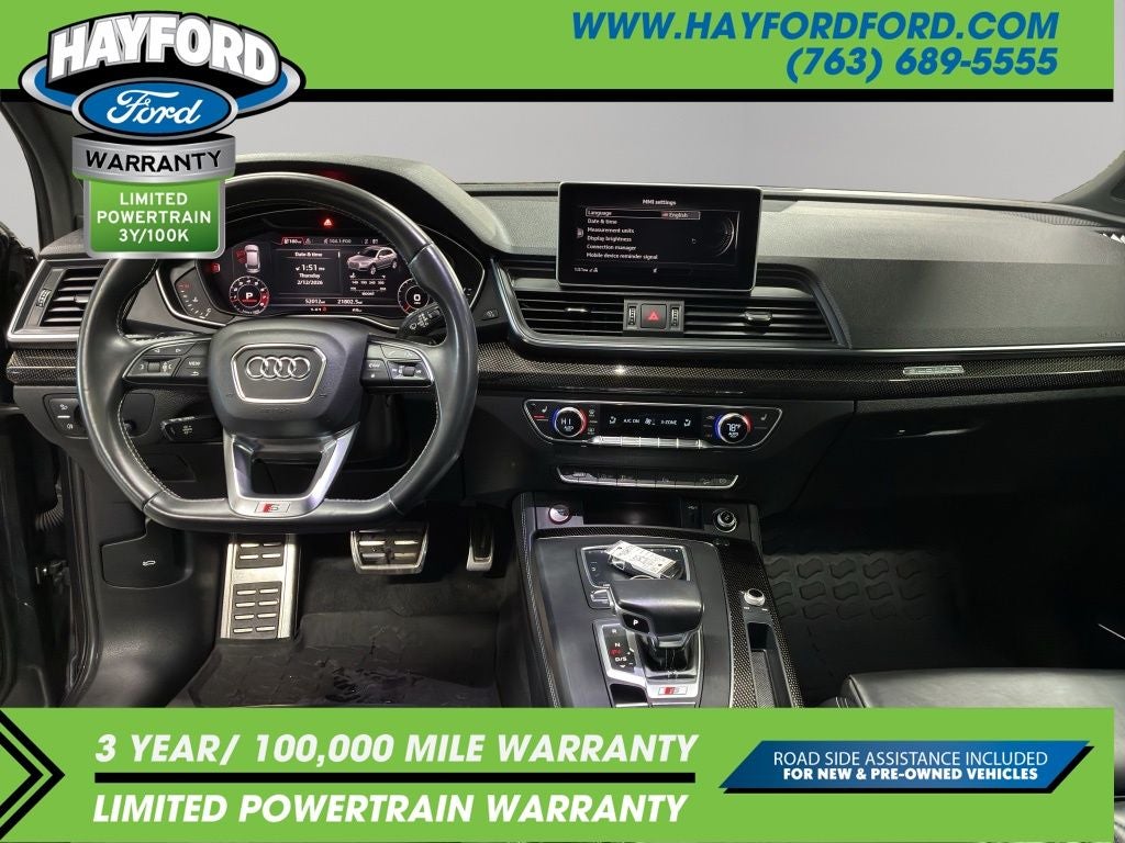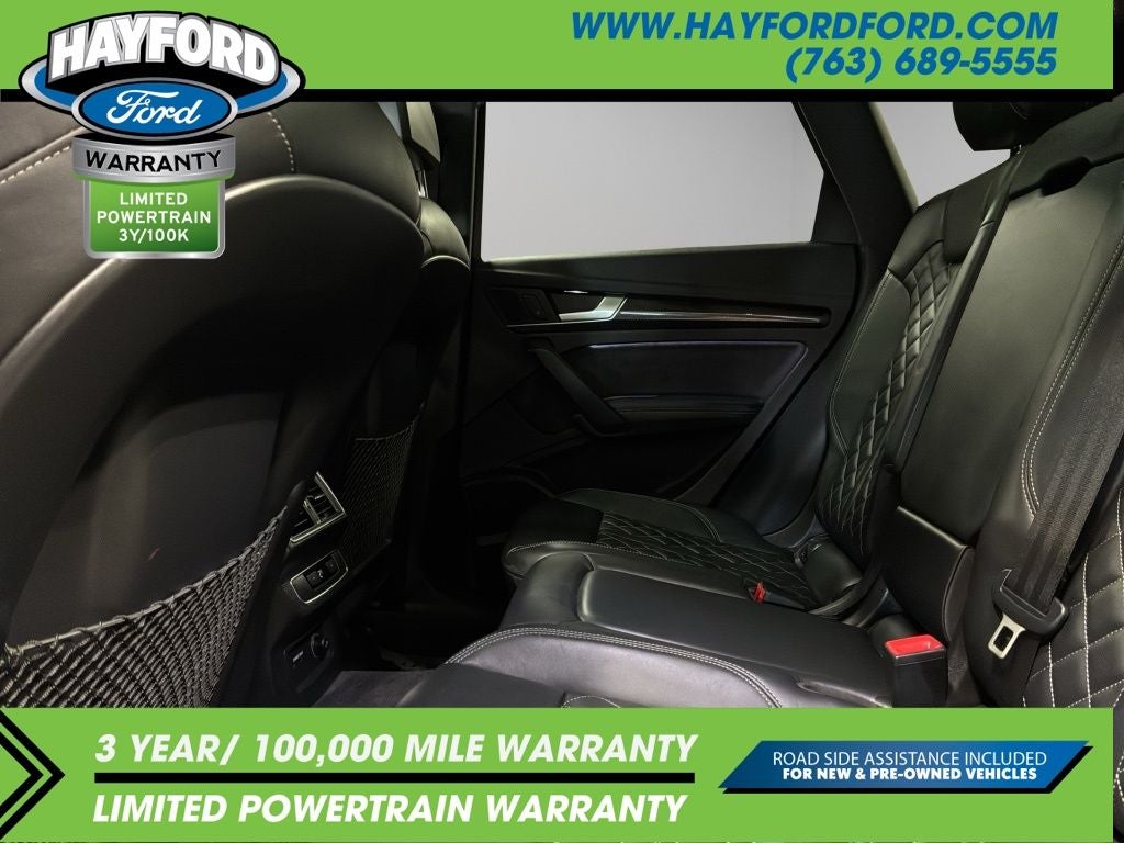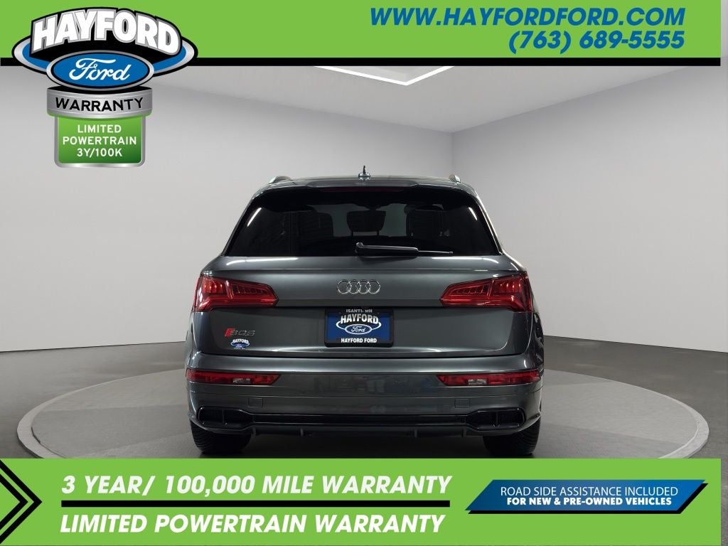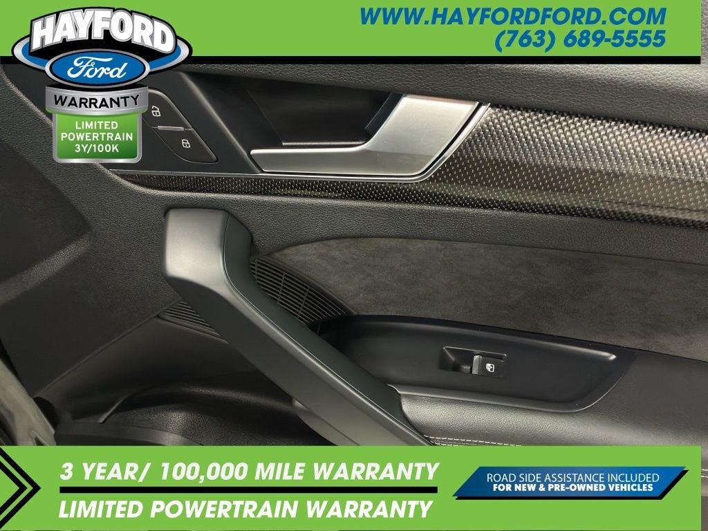 Contact Hayford Ford at (763)689-5555 or Visit us online at www.hayfordford.com for more pictures and details. Come take a test drive today. Located 2 Miles north of Isanti on Hwy 65. Internet price includes $500 Hayford Finance Bonus and $500 Trade-in Bonus. Ask For details. Check out this vehicle's great Black Optic Package (High-Gloss Black Exterior Mirror Housings, Matte Black Roof Rails, Titanium Black Exterior Trim, and Wheels: 20 Audi Sport 5-Arm-Rotor Design), Convenience Package (Audi Advanced Key, Audi Pre-Sense Rear, Audi Side Assist, Auto-Dimming Power Folding Exterior Mirrors, Driver Seat Memory, and SiriusXM All Access Service), Fine Nappa Leather Interior (Fine Nappa Leather Seating Surfaces), Premium Plus Package (Audi Connect PRIME & PLUS, Audi Phone Box, Audi Virtual Cockpit, Leatherette Covered Center Console, Panoramic Sunroof, Parking System Plus (Front/Rear Acoustic Sensors), Radio: MMI Navigation Plus w/MMI Touch, and USB Charge Ports for Rear Seats), S Sport Package (Red Brake Calipers, Sport Adaptive Air Suspension, and Sport Rear Differential), Delay-off headlights, Navigation System, 10 Speakers, 3.204 Axle Ratio, 4-Wheel Disc Brakes, ABS brakes, Adaptive suspension, Air Conditioning, All Weather Floor Mats, Alloy wheels, AM/FM radio, AM/FM Stereo, Audi Beam-Rings, Audi Guard Protection Kit, Audi smartphone interface (Apple CarPlay/Android Auto), Auto-dimming Rear-View mirror, Automatic temperature control, Bang & Olufsen 3D Sound System, Brake assist, Bumpers: body-color, Carbon Atlas Inlays, Cargo Mat, Compass, Driver door bin, Driver vanity mirror, Dual front impact airbags, Dual front side impact airbags, Electronic Stability Control, Emergency communication system: Audi connect CARE, Exterior Parking Camera Rear, Four wheel independent suspension, Front anti-roll bar, Front Bucket Seats, Front Center Armrest, Front dual zone A/C, Front fog lights, Front reading lights, Garage door transmitter: HomeLink, Heated door mirrors, Heated Front Seats, Heated front seats, Illuminated entry, Leather Shift Knob, Leather steering wheel, Leather/Alcantara Seating Surfaces, Low tire pressure warning, Occupant sensing airbag, Outside temperature display, Overhead airbag, Overhead console, Panic alarm, Passenger door bin, Passenger vanity mirror, Power door mirrors, Power driver seat, Power Liftgate, Power passenger seat, Power steering, Power windows, Radio data system, Rain sensing wipers, Rear air conditioning, Rear anti-roll bar, Rear fog lights, Rear Load Sill/Door Cup/Door Edge Paint Protection, Rear reading lights, Rear seat center armrest, Rear window defroster, Rear window wiper, Remote keyless entry, Roof rack, Security system, Speed control, Speed-sensing steering, Speed-Sensitive Wipers, Split folding rear seat, S