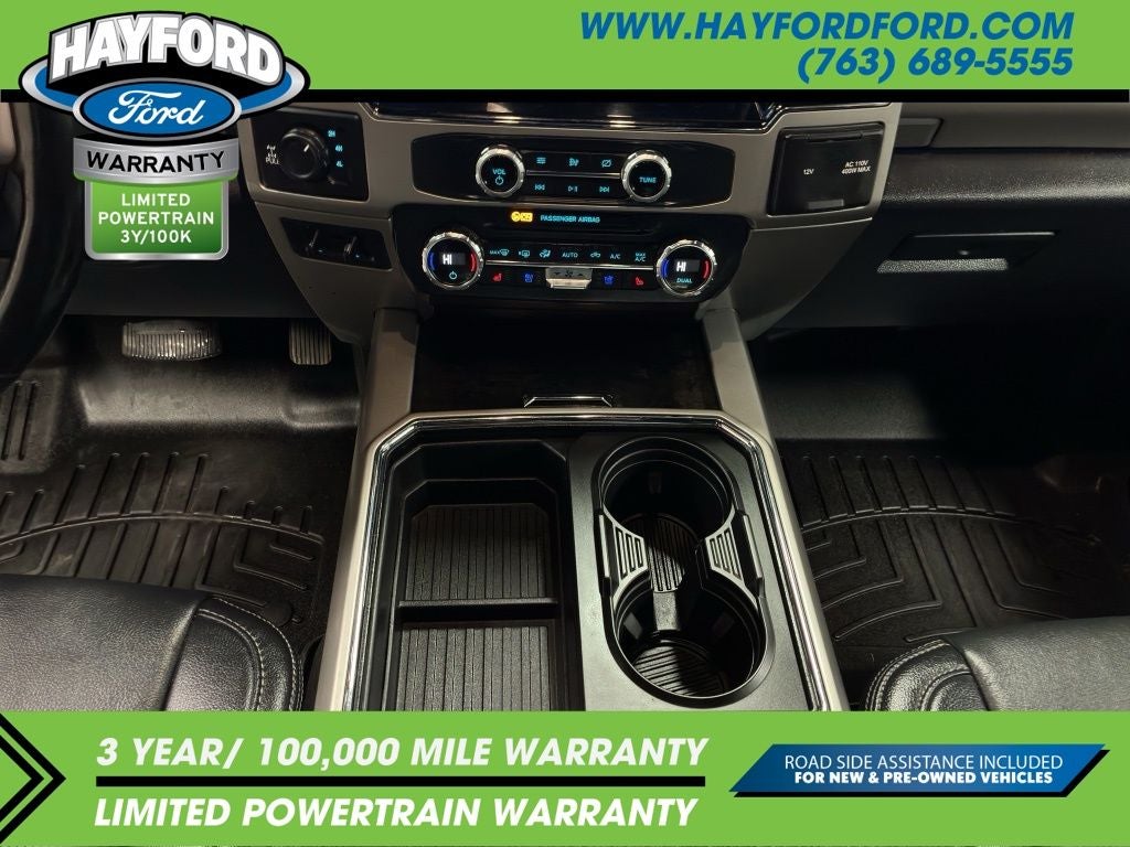Contact Hayford Ford at (763)689-5555 or Visit us online at www.hayfordford.com for more pictures and details. Come take a test drive today. Located 2 Miles north of Isanti on Hwy 65. Internet price includes $500 Hayford Finance Bonus and $500 Trade-in Bonus. Ask For details. Check out this vehicle's great Chrome Package (6 Angular Bright Polished Step Bars, Body-Color Door Handles w/Chrome Insert, Chrome Exhaust Tip, PowerScope Trailer Tow Mirrors w/Heat, Unique Chrome Mirror Caps, and Wheels: 18 Chrome PVD Aluminum), FX4 Off-Road Package (Hill Descent Control, Off-Road Specifically Tuned Shock Absorbers, and Unique FX4 Off-Road Box Decal), GVWR: 12,400 lb Payload Package, Lariat Ultimate Package (Ambient Lighting - Fixed Color, Easy Entry®/Exit Memory Driver's Seat Feature, Intelligent Access w/Push-Button Start, LED Box Lighting, Memory Power-Adjustable Pedals, Power Heated/Ventilated Driver Seat w/Memory, Power Heated/Ventilated Passenger Seat, Power Telescoping/Tilt Steering Wheel/Column, PowerScope Trailer Tow Mirrors w/Memory, Remote Start System, Remote Tailgate Release, and Tailgate Step & Handle), Order Code 618A, Snow Plow/Camper Package (Rear Stabilizer Bar), Electronic-Locking w/3.31 Axle Ratio, Heated door mirrors, Navigation system: Connected Navigation, Speed control, 10 Speakers, 397 Amp Alternator, 4-Wheel Disc Brakes, 6 Angular Bright Polished Step Bar, ABS brakes, Adjustable pedals, Air Conditioning, Alloy wheels, AM/FM radio: SiriusXM with 360L, Auto High-beam Headlights, Auto-dimming Rear-View mirror, Automatic temperature control, Brake assist, Bumpers: chrome, Compass, Delay-off headlights, Driver door bin, Driver vanity mirror, Dual front impact airbags, Dual front side impact airbags, Electronic Stability Control, Emergency communication system: SYNC 4 911 Assist, Engine Block Heater, Exterior Parking Camera Rear, Flow-Through Console, Front anti-roll bar, Front Bucket Seats, Front Center Armrest, Front dual zone A/C, Front fog lights, Front Leather Seating Surfaces 40/Console/40, Front reading lights, Fully automatic headlights, Illuminated entry, Leather steering wheel, Low tire pressure warning, Outside temperature display, Overhead airbag, Overhead console, Panic alarm, Passenger door bin, Passenger vanity mirror, Power door mirrors, Power driver seat, Power passenger seat, Power steering, Power wind